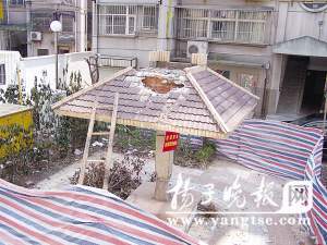 記者在該小區(qū)看到,一架爬梯搭在涼亭頂部,廢磚石塊散落一地,周圍用帆布圍起來,涼亭頂部露出兩個(gè)直徑約一米寬的大窟窿,柱子底部已經(jīng)被人鑿出凹面。該小區(qū)物管公司負(fù)責(zé)人對(duì)記者說,涼亭是上個(gè)月下旬被小區(qū)一姜姓女業(yè)主砸毀的,帆布和告示牌都是她設(shè)置的。“家里發(fā)生一連串怪事,后來聽人說都是因?yàn)檫@個(gè)涼亭壞了風(fēng)水!38歲的姜女士對(duì)記者說,前年4月份她在該小區(qū)買了現(xiàn)在居住的房子!叭ツ8月份,小姑子12歲的兒子,星期天外出開電瓶車,出了交通事故,把腿撞斷了,一年后才把腿傷治好。還有去年丈夫在上海做廢鋼生意,虧了幾百萬(wàn)元。另外,我有心臟病,身體一直不好……”姜女士說,一連串的不幸讓她心情變得壓抑。后來,她聽人講,小區(qū)里的涼亭正好對(duì)著她家陽(yáng)臺(tái)的窗戶,壞了家中風(fēng)水。于是,她于2月24日喊人把小區(qū)涼亭砸了。