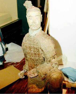 據(jù)陜西歷史博物館館長(zhǎng)成建正介紹,這件綠面跪射俑即使在兵馬俑博物館也僅展出過一次,平時(shí)都是用布將兵馬俑包裹起來的。該俑是考古隊(duì)在1999年9月10日在二號(hào)坑發(fā)現(xiàn)的。整個(gè)兵馬俑身上都施以彩繪,尤其是面部彩繪完整,白色眼白,黑色瞳孔,雙眼炯炯有神。不同于其他陶俑的淡粉面色,淡綠面色尤其引人注目。該俑的出土,引起了文物專家的爭(zhēng)論,誰(shuí)也不能確定為什么這尊俑的面部要施以綠色顏料,甚至有人猜測(cè)“綠面”有可能是工匠們的惡作劇。
