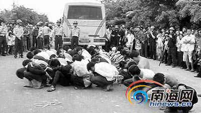 兩名沙場老板因經營利益問題產生糾紛,雙方各組織幾十人乘3輛大卡車持長粉槍、長勾刀等兇器欲進行火拼。臨高警方得到消息后迅速組織160警力、20余輛警車圍追堵截,成功制止了一起聚眾斗毆事件,避免了流血事件發(fā)生。此次行動,臨高警方共查扣違法車輛6部,抓獲涉嫌持械斗毆嫌疑人58名。其中43人被刑拘、12人被行政拘留、3人待查。