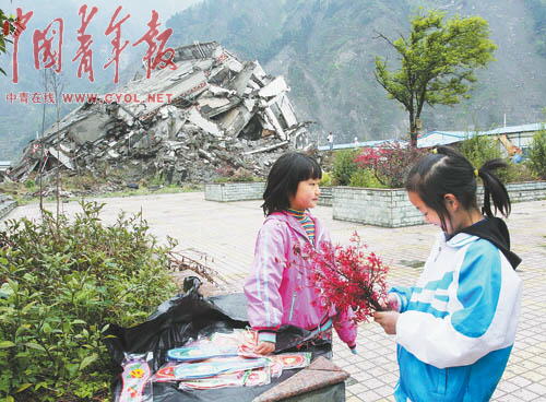 這里是映秀鎮(zhèn)“5·12特大地震”遇難者公墓,安放著數(shù)千名地震遇難者的遺體,清明前的這個周末,不少遇難者家屬紛紛前來祭掃親人。山下,賣香燭紙錢的攤點上放著的一張張地震照片讓不少人暫時停下腳步。有的照片還被做成書簽,旁邊配上自己填的詞:“憶秦娥,5·12震中,二00八年五月。西風(fēng)烈,震龍沖出火五月。火五月,映秀顫抖!廢墟聲裂......”從城里趕回來“看”父親的彭瑞,正在仔細地端詳著照片!鞍职志褪窃谶@里遇難的。”他指著照片上的廢墟說。地震時,他在附近的漩口中學(xué)上高三,如今他已是成都一所大學(xué)的大學(xué)生。除了照片,攤點上還放著關(guān)于地震的CD光碟。守攤的小姑娘介紹,這些都是從鎮(zhèn)里的集市上批發(fā)來的,光碟里主要是當?shù)仉娨暸_播放的地震后搶救學(xué)生的報道!坝行┩尥匏赖煤脩K啊,連我爸爸看后都哭了!彼f。