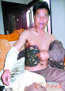 45歲的林先生心有余悸地告訴記者:“3月25日下午3時(shí)10分左右,我坐別人的摩托車(chē)去鎮(zhèn)里辦事。突然間聽(tīng)到一聲爆響,一股濃煙伴著一團(tuán)刺眼的火花從身下冒出,腰腹間傳來(lái)一陣劇痛,身上衣服也突然著起了大火,連司機(jī)背上也著起了火!