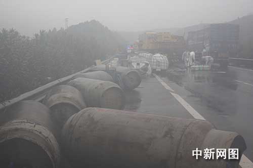 事故的影響,當(dāng)天上午9點(diǎn)多,高速公路上被堵車輛綿延數(shù)公里。大掛車雖已被吊離,但現(xiàn)場(chǎng)地面上仍冒著白煙,附近散落著許多木箱、玻璃碎片和一些裝有危險(xiǎn)品的大桶。安監(jiān)、環(huán)保等部門做了現(xiàn)場(chǎng)勘查,工作人員用石灰中和等多種措施來減少酸性物質(zhì)對(duì)周邊土壤的腐蝕。