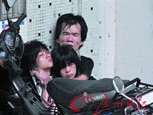 當(dāng)三輪摩托車開到城東派出所門前,杜某民嫌車速太慢,叫司機(jī)開摩托車進(jìn)入城東派出所院內(nèi)。下車后,杜某民用小刀架在小李的脖子上,用手扣住小袁的脖子(見圖),大聲叫喊:“有人殺人了,快報(bào)案”,然后把小李、小袁兩人推到城東派出所飯?zhí)靡唤锹洌纸校骸鞍阉泄捕冀谐鰜?lái)。”