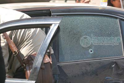 黑色尼桑車上的司乘人員已不知去向。記者注意到,尼桑車后車窗上有一圓形小孔,小孔四周的玻璃出現(xiàn)像蛛網(wǎng)一樣的大面積裂痕,很像子彈穿過的痕跡。有一名戴白色手套的男子在車周圍進行檢查,并以警方正在辦案為由拒絕接受記者采訪。