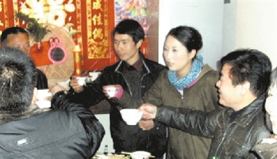 馬艷霞和童利祥是3月2日舉行的結(jié)婚儀式,貼在馬艷霞娘家大門(mén)上的一副對(duì)聯(lián)仍然鮮艷。馬艷霞的父親馬雙俊高興地給記者念對(duì)聯(lián):“愛(ài)情同勞動(dòng)美麗,青春靠知識(shí)閃光”。