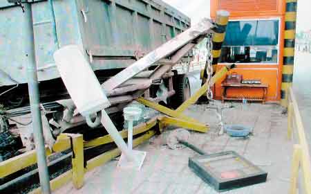 昨天上午,一輛拉沙石的大型拖拉機(jī)突然失控,直接撞向108國(guó)道黑河大橋收費(fèi)亭,致使正在亭里值班的兩名收費(fèi)員受傷。