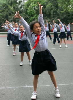 昨日上午,在該校操場上,幾十名學生代表正在體育老師的帶領(lǐng)下,練習該套體操。喇叭里面播放著由古箏彈奏的《漁舟唱晚》和童聲朗誦的《弟子規(guī)》合成的“體操旋律”音樂,極富古典韻味。學生們則隨著音樂,一邊大聲朗誦著《弟子規(guī)》,一邊“做操”。體操的動作包括古代的站、行、坐、讓、孝、禮等系列動作,還富含太極韻味。全套體操有3分多鐘,運動量不大。一邊做操一邊朗誦,讓學生們覺得“很有趣”。