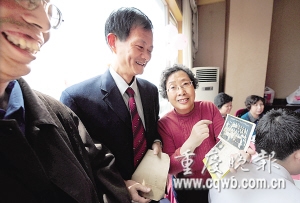 64級1班學(xué)生、在渝中區(qū)統(tǒng)戰(zhàn)部工作的王有惠為老師獻上一副題字,5班一位男學(xué)生奉上一幅書畫。“這不是當(dāng)年的窮孩子馬慶嗎?”王忠篤說,馬慶父親早亡,母親獨自供養(yǎng)馬慶三兄弟,生活很困難。學(xué)校想辦法給他提供了每月8元的助學(xué)金,老師們也幫他湊生活費!靶iL,我剛從渝中區(qū)商委主任和總工會主席的位置上退下來,以后會常來看您。”61歲的馬慶含淚道。