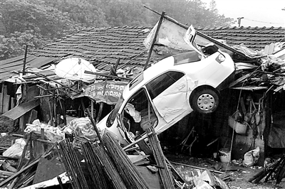 昨日上午,記者趕到現(xiàn)場看到,一輛“受傷”的白色轎車車頭朝下,車尾朝上,倒立著“掛”在民房的屋頂上,轎車車頭撞得面目全非,車身兩側(cè)凹陷,車內(nèi)兩個(gè)安全氣囊也完全打開(見圖)。民房旁邊,一根水泥電桿攔腰被撞斷,地上還散落著汽車零部件,不少路人冒雨在看稀奇。