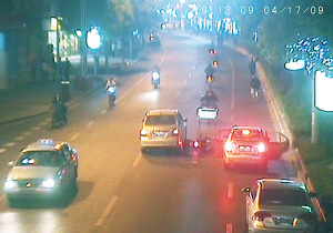 從回放的錄像中,記者清楚地看到,在非機(jī)動(dòng)車道上,違章停放的尼桑車前方幾米處,曾出現(xiàn)過一輛淺色私家車。該車剛停下不久,騎車人的身影就出現(xiàn)在了畫面中,只見右后側(cè)車門先打開,有個(gè)大約六七歲的長發(fā)小女孩下了車。幾乎與此同時(shí),左后側(cè)車門也毫無預(yù)警地打開了,正巧刮擦到了猝不及防的助動(dòng)車,騎車人瞬間倒地,瞬間的突發(fā)情況以致后續(xù)緊跟著的頤達(dá)車盡管慢速行駛卻也根本無法避讓,硬生生壓過騎車人。