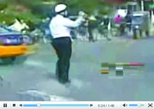 視頻中的出租車和公交車顯示,該視頻拍于北京。網(wǎng)友“backen”說,視頻中的交警在海淀上地環(huán)島附近。