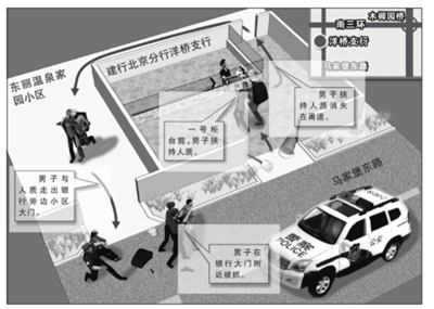 一號(hào)柜臺(tái)是一名男業(yè)務(wù)員,表現(xiàn)得比較冷靜。業(yè)務(wù)員邊勸其冷靜,邊將一沓沓百元人民幣推到窗外,整個(gè)動(dòng)作很緩慢。劫匪情緒激動(dòng),一直在催促動(dòng)作快些。幾分鐘后,劫匪顯然失去耐性,將已經(jīng)拿出的現(xiàn)金裝到黑色背包中。據(jù)警方事后發(fā)布,被裝進(jìn)背包的現(xiàn)金共14萬元。劫匪勒著喬女士的脖子向大廳內(nèi)側(cè)的通道走去。其間,喬女士在不停叫喊,這時(shí)門口的人才看到,在劫匪的左手上還有一把刀架在喬女士脖子上,右手黑色手槍卻沒有指著人質(zhì),帶著人質(zhì)消失在甬道內(nèi)。