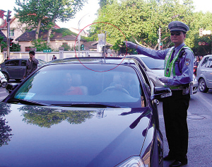 前天傍晚6點(diǎn)多,南京交警五大隊(duì)民警喻何鑫正在北京西路西康路路口值勤,這時(shí)電臺(tái)突然響了,在云南路執(zhí)勤的同事告訴他,剛剛有一輛黑色轎車駛過,從天窗中伸出一根桿子,上面還掛著一個(gè)塑料袋。同事讓他攔下檢查一下,于是小喻就在路口等待。很快,一輛黑色轎車駛來,小喻定睛一看,就是同事說的那輛車。再仔細(xì)辨認(rèn),小喻嚇了一跳,原來這伸出天窗的居然是一根掛水桿,上面還有輸液袋。難道是車主一邊掛水一邊開車,小喻趕緊上前將該車攔下,靠邊停車后,他才發(fā)現(xiàn)是坐在副駕上的女子在掛水!熬尤荒苓@樣掛水,真是神奇”,“看來天窗也有好處啊,桿子伸出來方便!甭愤^市民看到這一“奇景”后紛紛駐足議論。