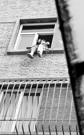 “你真傻啊,有啥想不開的,非要抱著自己的孩子尋短見?”樓下,人群中一名中年婦女不停地勸著!皠e管我,他不回來,我也不活了!迸忧榫w很激動,左手抱著孩子,右手扶著窗戶,邊哭邊說,并時不時騰出手比畫一番。懷里的孩子一直朝外看著,也不時地扭動身子,讓樓下的人群為倆人的安全捏一把汗。