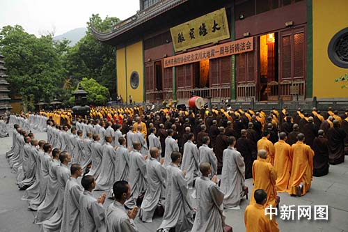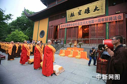 中新網(wǎng)杭州5月12日電(記者 柴燕菲 見習(xí)記者 周翌)一年前的今天,巴蜀大地一聲長(zhǎng)嘆,舉國(guó)旗半落以致哀,笛長(zhǎng)鳴以悲愴。一年后的今天,巴蜀大地重獲新生,如鳳凰涅磐。一年來,汶川的陣陣喘息,步步前進(jìn)都牽動(dòng)著全國(guó)人民的視線。2009年5月12日16時(shí)30分,杭州市佛教界各大寺院300余僧眾會(huì)聚千年古剎靈隱寺,隆重舉行汶川大地震一周年祈禱法會(huì)。