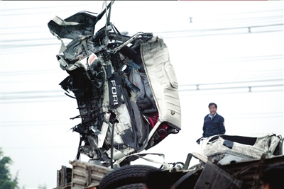 凌晨4點左右,現(xiàn)場只剩下4輛被毀嚴重的事故車。現(xiàn)場散落著飲料瓶、家具零件和成卷的鋼索,這些都是大貨車上裝載的貨物。4輛貨車駕駛室均嚴重變形,一輛大貨車的駕駛室被燒成了空殼。