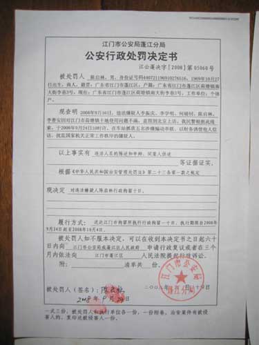 但是,對于江門日報刊登的報道,一名網(wǎng)友給本網(wǎng)提供了《行政處罰決定書》的圖片,在該圖片上可以清楚地看到,決定書上寫著“現(xiàn)查明2008年9月16日,違法嫌疑人……因?qū)T市荷塘鎮(zhèn)土地使用問題不滿,意圖到北京上訪。我民警根據(jù)此線索,于2008年9月24日10時許,在車站抓獲五名涉嫌煽動串聯(lián)、以財務(wù)誘使他人信訪,擾亂國家機關(guān)正常工作秩序的嫌疑人”,在決定書下方有被處罰人簽名和指模,以及江門市公安局蓬江分局蓋印。該名網(wǎng)友同時提出質(zhì)疑,聲明摘錄如下: