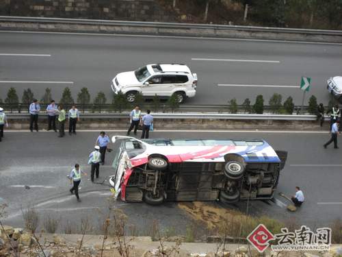 18日下午1點(diǎn)45分,安楚高速公路昆明至楚雄方向K128+500米處(孔家莊隧道出去1公里)發(fā)生一起重大交通事故,一輛從下關(guān)開往昆明載有29人的中型客車發(fā)生側(cè)翻,當(dāng)場(chǎng)死亡1人,28人受傷,其中重傷1人。事故發(fā)生后,交警部門對(duì)楚雄至昆明方向的高速路實(shí)施了封閉,記者去現(xiàn)場(chǎng)只能從320國道繞行至山上的小路,站在在距離事故現(xiàn)場(chǎng)約30米的山坡上,記者看到在開往昆明方向的高速路上,一輛客車側(cè)翻在路中間,雖是開往昆明方向,但車頭卻調(diào)轉(zhuǎn)了朝著相反方向。凹陷的車頭上,擋風(fēng)玻璃像蜘蛛網(wǎng)一樣滿是裂痕,右側(cè)有個(gè)很大的窟窿,車身旁邊一道長(zhǎng)長(zhǎng)的劃痕非常明顯,車身下漏了一大灘汽油,一塊標(biāo)有大理兩個(gè)字的白色牌子飛到了距離客車有5、60米的地方。這時(shí)交警部門正在做現(xiàn)場(chǎng)勘查,在汽油上散上了沙子。 “嘭”,我當(dāng)時(shí)聽到一聲巨響,跑出來一看,就看見一輛客車翻在坡底的高速路上,有個(gè)人被甩出了車外躺在地上一動(dòng)不動(dòng),其他的乘客在車上哭的哭,喊的喊。”高速路旁的楚雄大瓦房村的一位村民目睹了車禍時(shí)的情景。附近一位路過的駕駛員猜測(cè)說,從擋墻在撞擊的痕跡上看,客車可能是撞上可擋墻后,又反彈回來,駕駛員急忙打方向盤,車子就來了個(gè)360度大轉(zhuǎn)身后翻倒在地。“這段路過了隧道后,因?yàn)槭窍缕侣范危簧俅筌囁緳C(jī)踩剎車時(shí)會(huì)不停地淋水,所以路面比較滑,司機(jī)車速稍一快就容易出事!