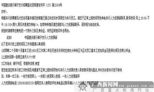 網(wǎng)友“l(fā)qqlauren”發(fā)帖稱,她即將畢業(yè)的妹妹最近收到一份“中國建設(shè)銀行南寧支行的面試錄用通知書”,錄用通知書上標(biāo)注的工作待遇極具有誘惑力,試用期工資1800元/月,轉(zhuǎn)正后還有獎金、醫(yī)保、社保、住房公積金。通知書最后留有“人力資源部劉主任”的手機號碼和一個“95533nn@163.com”電子郵箱。