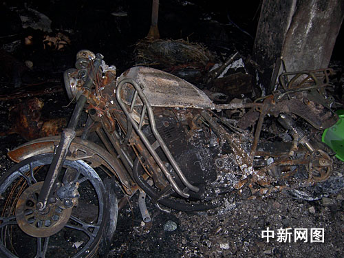 在一樓火災事故現(xiàn)場,記者看到房屋已被燒得漆黑一片,中間部位堆放的一些輔料和半成品全部過火,靠墻的一邊有一輛被燒毀的摩托車。輔料被燒后產(chǎn)生的大量濃煙將墻壁熏得灰黑。