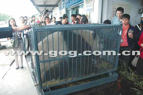 “大熊貓出來了!”載著樂水的推車剛一出現(xiàn)在貨運(yùn)部門口,立即被人們包圍。熱情的市民紛紛拿出手機(jī)或相機(jī)給樂水照相,剛下飛機(jī)的樂水低著頭,誰也不理會(huì)。經(jīng)24日先期抵達(dá)貴陽(yáng)的檢查扎佐野生動(dòng)物園大熊貓館的成都熊貓基地專家、高級(jí)畜牧師吳孔菊和飼養(yǎng)員陳敏觀察,第一次乘坐飛機(jī)的樂水和珠珠沒有暈機(jī)現(xiàn)象,除稍顯有些緊張外,總體良好。