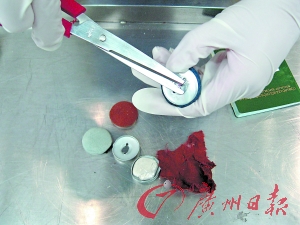 該名男子很快從行李托運區(qū)取回深藍色大號旅行包走無申報通道過關(guān),海關(guān)關(guān)員示意其將旅行包過X光機檢查,X光機成像顯示包內(nèi)有大量圓形顆粒狀物體。經(jīng)開包手工檢查發(fā)現(xiàn),該旅行包內(nèi)共有15件各色女式長連衣裙,每件長裙上均有絨布包裹的大號紐扣30多顆,共計532顆,海關(guān)關(guān)員隨機挑選一顆紐扣剪開后,發(fā)現(xiàn)一小包粉末狀物品被塑料薄膜包裝成扁圓形藏在其中,疑似毒品海洛因,緝私警察隨即對該名男子進行人身控制。