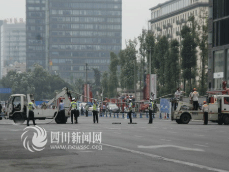 記者在現(xiàn)場未見到救護車輛,F(xiàn)場有近10輛消防車,交警正在疏導交通,成都主干道人民南路二段交通并未中斷。