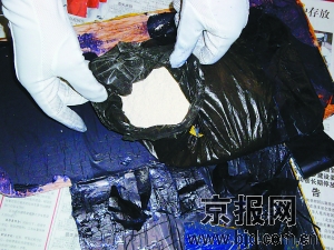 民警拿過(guò)嫌疑人手中的藍(lán)色手提包進(jìn)行檢查,發(fā)現(xiàn)提包底部的夾層鼓鼓囊囊,打開(kāi)一看,原來(lái)是層層包裹的白色海洛因,重約0.7公斤。經(jīng)初步審查,前來(lái)接頭的男子姓羅。偵查員根據(jù)掌握的情況,迅速趕往海淀某小區(qū),對(duì)男子阿某在北京的暫住地進(jìn)行搜查,成功起獲了數(shù)個(gè)塑料袋包裝的1.1公斤海洛因毒品。