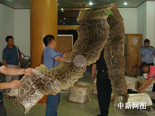 據(jù)防城港市森林公安清點(diǎn)統(tǒng)計(jì),警方截獲的大貨車內(nèi)共有173只熊掌、4張蟒蛇皮和國(guó)家二類保護(hù)動(dòng)物穿山甲1只。其中,最長(zhǎng)的蟒蛇皮達(dá)5米。