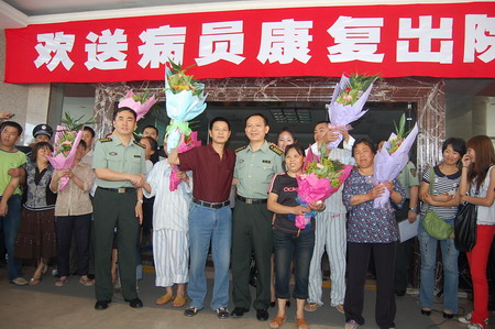 8日下午,9名在“6•5”公交燃燒事故中受傷的輕傷員從成都軍區(qū)總醫(yī)院出院,醫(yī)院在外科樓前舉行了歡送康復傷員出院儀式。