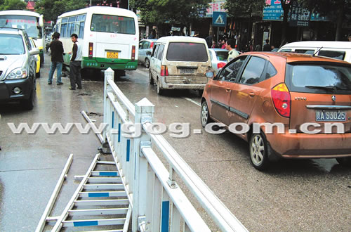 接到報(bào)料,記者趕到現(xiàn)場(chǎng)看到,車牌號(hào)碼為貴AU5063的90路中巴車停在馬路中央隔離帶上,車頭擋風(fēng)玻璃全部撞破,右后輪處車身被撞凹一大片,車內(nèi)灑滿擋風(fēng)玻璃碎片。另外一輛車牌號(hào)碼為貴AU5109的90路中巴車停在路邊,車尾左部被撞變形,公路中央隔離護(hù)攔被撞斷3塊,公路上撒滿殘片。
