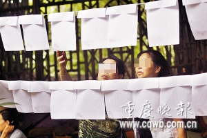 上午9時,沙坪公園春來茶樓,百余名老人圍著茶樓天井,在一張張相親牌上搜尋自己想要的伴侶?吹綏l件合適的人選,劉遠(yuǎn)山掏出筆記下,一旁的紅娘趕緊過來幫他確認(rèn)號碼是否正確!澳墙裉鞖q數(shù)最大的老人家,讓我們來為您服務(wù)!奔t娘說。劉遠(yuǎn)山笑著擺擺手:“用不著,我才80歲,還不老。”