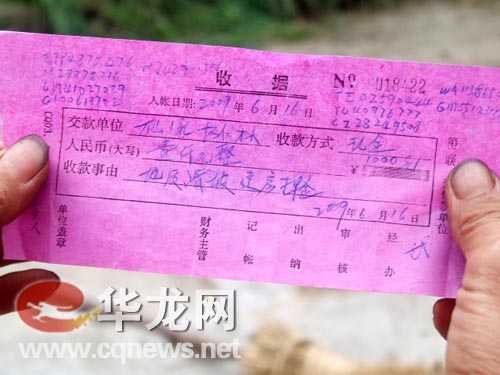 聞聽記者在當?shù)夭稍L,村民楊仁林的妻子將隨身攜帶的押金收據(jù)拿出來展示,楊仁林家編號為0018422號的白條“收據(jù)”上顯示,其收款事由為“‘地質(zhì)滑坡建房押金’壹仟元整”,交款時間為2009年6月16日,經(jīng)辦人:“武”。收據(jù)左右角上注明了其交款面額的編號。
