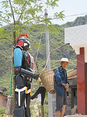 昨日,記者在這則《真牛,村民把變形金剛當(dāng)門神》帖子的照片上看到,一個(gè)巨大的黑色變形金剛模型,筆直的立在一民房外的木桿旁,從模型身上連接的電線可以看出,這應(yīng)該是一個(gè)電動(dòng)玩具,變形金剛旁還站著一位背著背簍,戴著草帽,滿臉黝黑的老伯,似乎對身邊的模型早已習(xí)以為常。