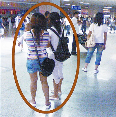 7月2日早晨6時(shí)許,記者再次來(lái)到出站口,不到十分鐘發(fā)現(xiàn)“目標(biāo)”:一個(gè)穿吊帶衫、熱褲的女孩。她皮膚白凈,又高又瘦,挎單肩藍(lán)色包,略施脂粉。不同于其他接站市民的是,她不看出站人群,不關(guān)注到站時(shí)間,只尋找人群中的中青年男子,主動(dòng)上前攀談。