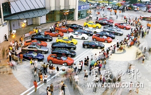 昨晚7時許,記者現(xiàn)場看到,23臺法拉利、瑪莎拉蒂轎車停放在遠東百貨門口的廣場上,四周拉有禁止靠近的警戒線,有近10名龍湖北城天街的保安值守,禁止圍觀市民靠近觸摸。