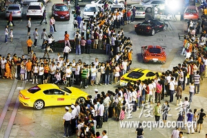 他介紹,這些豪車全部來自法拉利車友會,是重慶法拉利經(jīng)銷商從全國組織來重慶參加一個車友聚會,并可能在明天市內(nèi)一個場地舉行一個內(nèi)部賽車比賽。本來計劃共有30輛,結(jié)果只來了25輛。