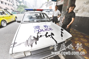 昨日,長航公安局朝天門派出所門前停車場,有不法人員惡作。合群笤诎▋奢v警車在內(nèi)的4輛車上用油墨涂鴉。警方稱,惡作劇者涉嫌故意損毀公私財(cái)物,可處10日以上15日以下拘留,并處罰款1000元。