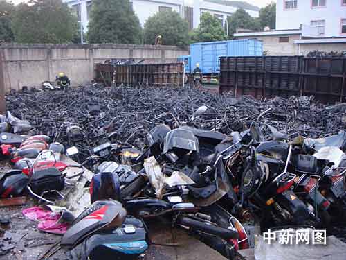 中新網(wǎng)寧波7月8日電(何蔣勇 歐陽峰)7日下午5時(shí)50分許,位于浙江省寧?h興寧中路45號(hào)的寧?h物資再生利用有限公司發(fā)生一起火災(zāi),濃煙沖天達(dá)百余米高,整個(gè)寧海縣城都能清楚地看到黑煙滾滾。當(dāng)?shù)叵啦块T先后出動(dòng)四輛消防車、近四十余名官兵參與火災(zāi)撲救,約40分鐘后成功將大火撲滅,但是該公司露天堆場內(nèi)近百輛廢舊摩托車被大火燒成骨架。