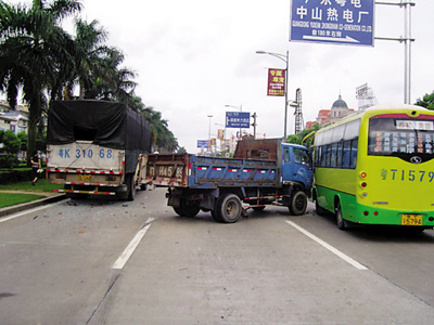 本月3日上午10時(shí),一男子駕駛粵T/H45×9大貨車在南三公路三角路段由超車道變主車道過程中,被后面同在超車道行駛的粵K310×8大貨車撞上了左后角,之后,粵T/H45×9大貨車失控沖過主車道又與在慢車道行駛的粵T157×4購物免費(fèi)接送車發(fā)生碰撞,事故造成購物免費(fèi)接送車上的一名乘客骨折受傷,三車受損。