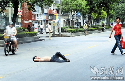 事發(fā)昨日正午,記者在漢陽郭茨口看到,一名男子上身裸露,手提一袋醫(yī)院的病歷資料,情緒激動地躺在馬路中央,脊背被路面燙得通紅。此時(shí)路面車流不息,該男子處境十分危險(xiǎn)!翱彀阉貋恚 睅酌啡艘姞詈,靠近該男子,欲將其拉到路邊,但該男子并不領(lǐng)情,堅(jiān)決不起身。幾分鐘后,二橋派出所的民警趕來,要求該男子去派出所再說,該男子置之不理。民警表示,早8時(shí)許和10時(shí)許,該男子曾在附近路面躺過兩次,都被他們帶回了派出所,他們這已是第三次為該男子出警!坝惺裁次驼f出來,那樣心里痛快點(diǎn)。”見民警束手無策,熱心路人們開始輪番上前勸解。眾路人汗流浹背,頂著烈日站在馬路中央,對該男子動之以情、曉之以理。半小時(shí)后,該男子陸續(xù)說出了心中的不快。又經(jīng)勸解,該男子終于答應(yīng)跟民警回派出所,將事情說清楚。