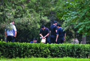 王明說,起初,藍(lán)衣男子出門后向東逃跑,跨進(jìn)了銀行旁的綠化帶,然后向南前行了幾步,隨即馬上轉(zhuǎn)身,沿反方向跑去。到達(dá)銀行對(duì)面的綠化帶時(shí),他和保安堵住了該男子。但藍(lán)衣男子沖著二人將瓶子里的無色液體灑出,隨后繞開他們,繼續(xù)向北跑去,很快就不見蹤影。