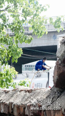 停車場的上面就是鄂黃大橋,記者繞行來到橋上面。剛找準位置停下,就看見一輛車身上印有“中國石油”的油罐車駛?cè)胪\噲。約5分鐘后,一名光著上身的男子開著三輪車駛?cè),車上裝著幾個大的空塑料油桶和一根塑料油管。油車司機迎了上去,并把三輪車停在油車的一側(cè)。約十分鐘后,三輪車駛出停車場,塑料桶內(nèi)已裝滿汽油。