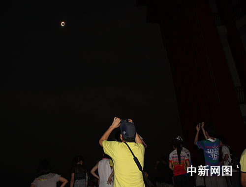 從21晚10時(shí)開始,陸續(xù)有民眾登上當(dāng)?shù)刂包c(diǎn)鳳凰山,等候日全食。22日7時(shí)許,記者在鳳凰山上山沿途看見數(shù)以萬計(jì)的民眾扶老攜幼,手持X光片、電焊防護(hù)鏡、黑色玻璃片、水盆等觀看工具,在鳳凰山上尋找最佳觀看位置。