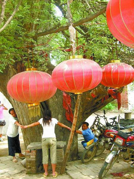 “這棵樹可有年頭。 贝迕駰罡鼈フf,這棵大槐樹已有一千多年的歷史,樹干周長將近5米,5個成年人才能把這棵大槐樹環(huán)抱住(如圖),偶爾會有人在樹下燒香,樹洞里布滿了蜘蛛網(wǎng),一直沒人管理。