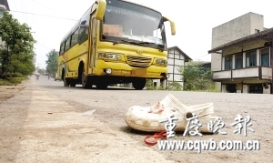 昨日上午11時(shí),記者前往現(xiàn)場(chǎng)發(fā)現(xiàn)。車禍發(fā)生在水土鎮(zhèn)藥王街入口處的“鑫旭酒樓”門(mén)前,肇事車當(dāng)時(shí)由水土鎮(zhèn)往金刀峽方向行駛。盡管車禍現(xiàn)場(chǎng)已被交警部門(mén)處置,肇事轎車被拖走,但現(xiàn)場(chǎng)仍可見(jiàn)大量血跡遺留地面,一雙沾有血跡的女式白色涼鞋靜靜地躺在馬路中間。旁邊圍墻上,肇事轎車將其撞開(kāi)了一個(gè)籃球大小的窟窿。