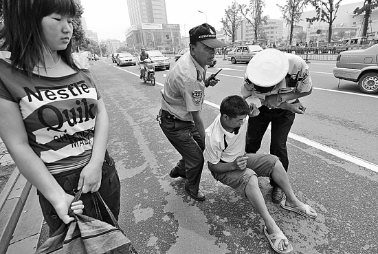 一直低著頭坐在地上的小高突然抬起頭,脫下鞋扔向人群,并嚷著“我不去!”喊完后他又蹲下來(lái)拼命地用頭撞擊身邊的石墩:“我沒有工作,我死了算了!”