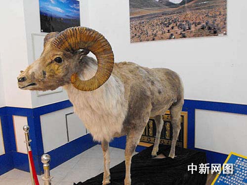 阿克塞哈薩克族自治縣縣委宣傳部熱提劍今日向記者介紹,該縣展覽館陳列的盤羊標(biāo)本是國家二級保護(hù)動物,屬?浦畜w型最大的一種,棲息于海拔2000——5000的沙漠和山地交界的沖擊平原和山地低溝中。雄性角粗大,由頭頂向下并向后螺旋狀彎曲,幾乎可達(dá)360度,主要分布在阿克塞哈薩克族自治縣境內(nèi)于大、小哈爾騰前山和安南壩地區(qū)。