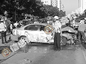 記者看到,肇事司機(jī)是一名外國人,其面部受傷流血,旁邊站著兩名戴墨鏡、衣著時(shí)尚的妙齡女子。老外面部表情痛苦,靠著損壞的車門坐在地上休息,兩女子不停地打著電話。
