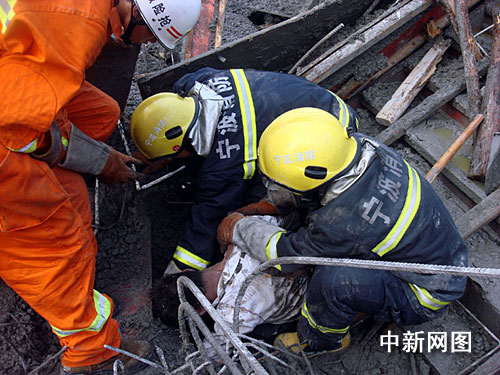 隨后,12名消防官兵手持鐵錘、十字鎬、無齒鋸、液壓擴張剪、生命探測儀冒著生命危險爬上已經(jīng)倒塌的三樓,先用生命探測儀對現(xiàn)場進行探測,沒有發(fā)現(xiàn)生命跡象。最后,在工人的幫助下,消防官兵們找到位置,消防官兵用十字鎬、鐵鍬一點一點的把壓住賈廣進的混泥土慢慢的、扒出,最后利用無齒鋸把鋼筋切斷,40分鐘后,賈廣進被成功抬上救護車。